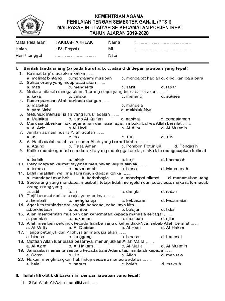 Soal akidah akhlak kelas 5 sd/mi semester 1 kunci jawaban. Soal latihan pas/ uas aqidah akhlak kelas 4 dan jawaban semester 1 k 13 sesuai kma 183 th. Pada kesempatan kali ini akan kami bagikan kumpulan soal aqidah akhlak kelas 7 / vii mts semester 1 dan 2 beserta kunci jawaban. Download soal uas aqidah akhlak kelas 1 semester ganjil.